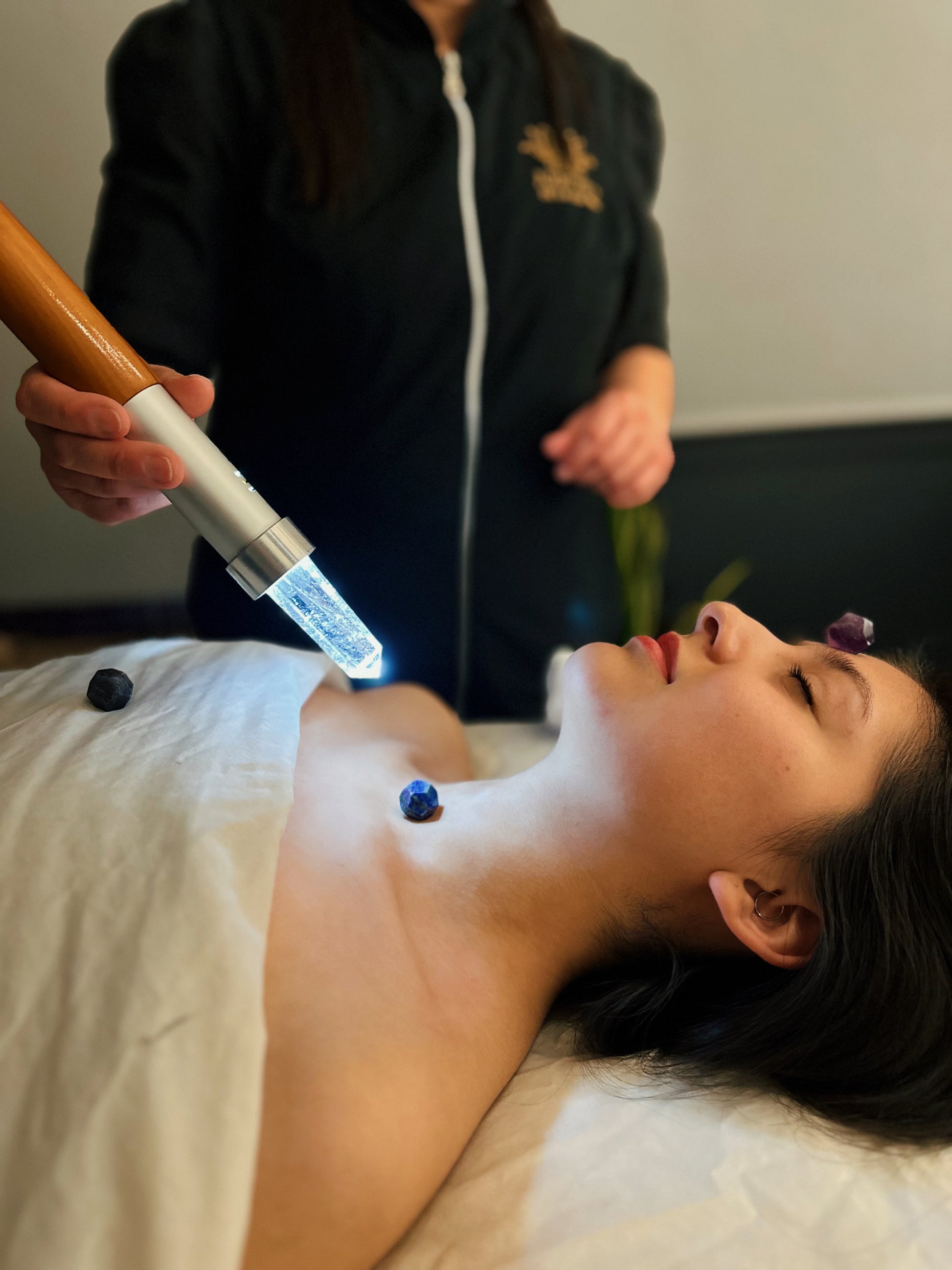 Terapia que mezcla la terapia de reiki con gemoterapia más el trabajo especifico en cada chakra con el bastón atlante que refleja el color a través de su punta de cuarzo, mientras los sonidos de los cuencos nos ayudan a la desconexión para lograr una asertiva lectura de nuestro campo energético y además se prepara una mezcla individual para que la persona siga en su casa con el apoyo emocional de las flores de bach.